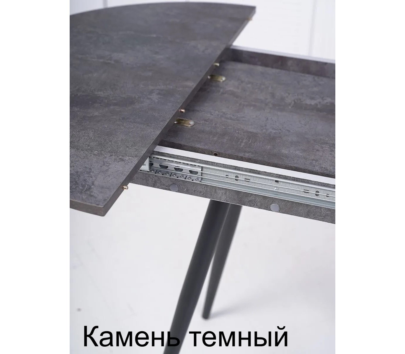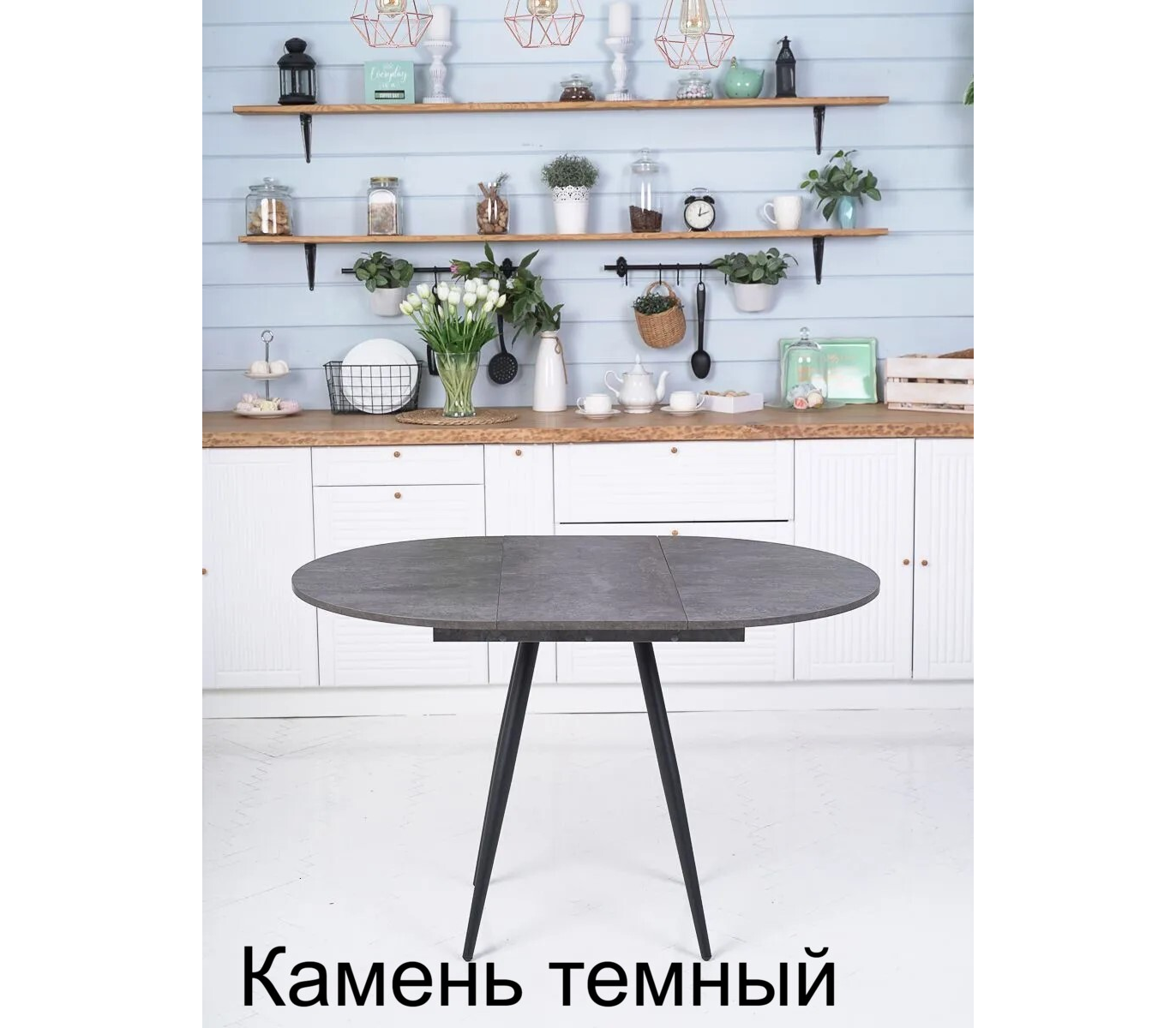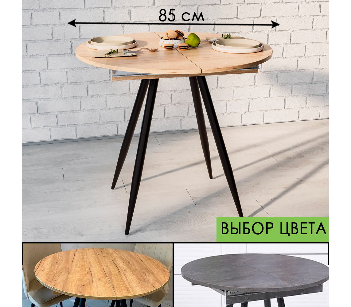 Стол обеденный раздвижной ВВР (Дуб/Черный металлик), 85х85(120) см Современный круглый стол на металлическом каркасе. Отличное решение для небольшой кухни или гостиной. Благодаря вставке столешница увеличивается с 85 до 120 см, позволяя с комфортом разместить до 4 человек.