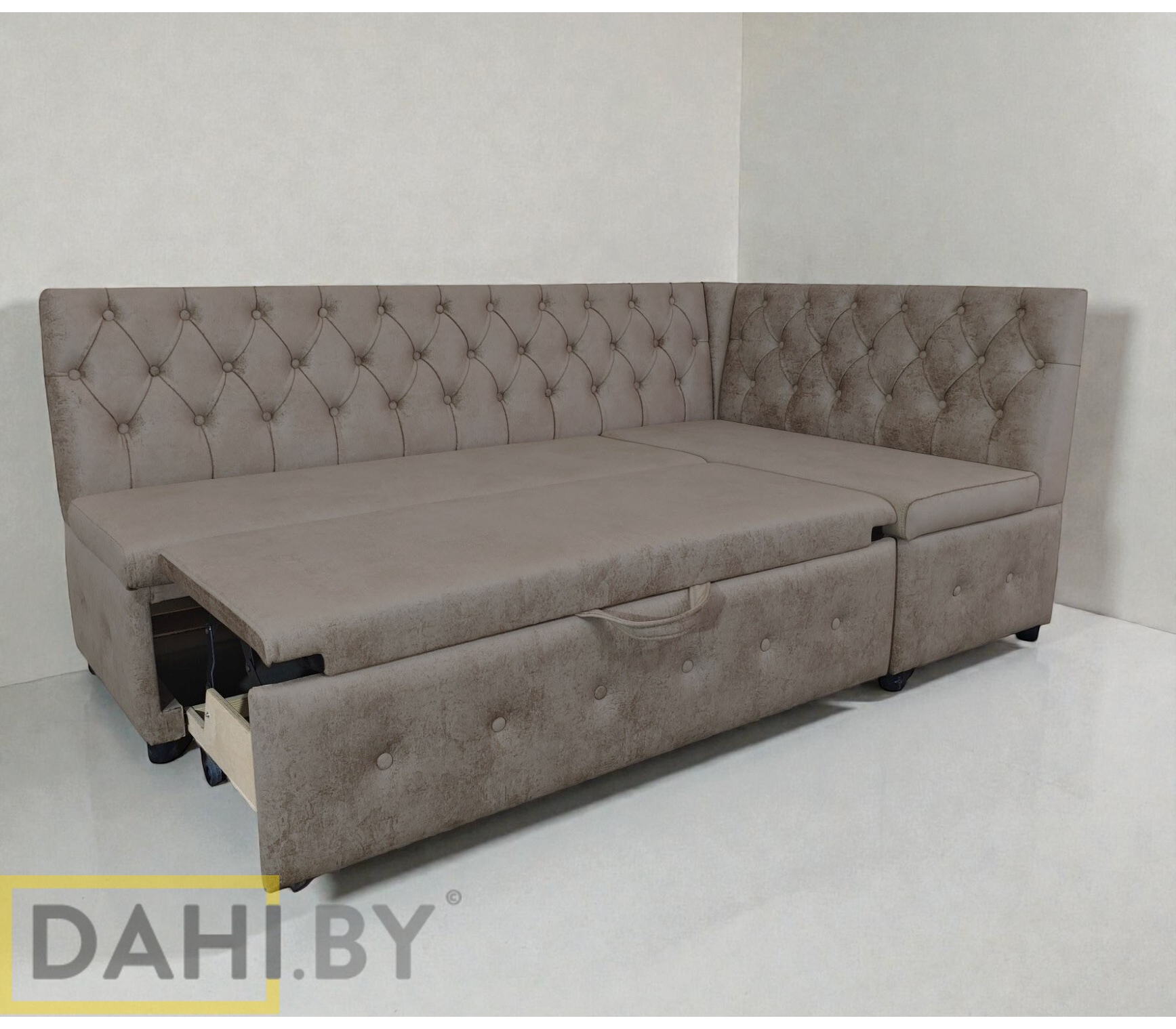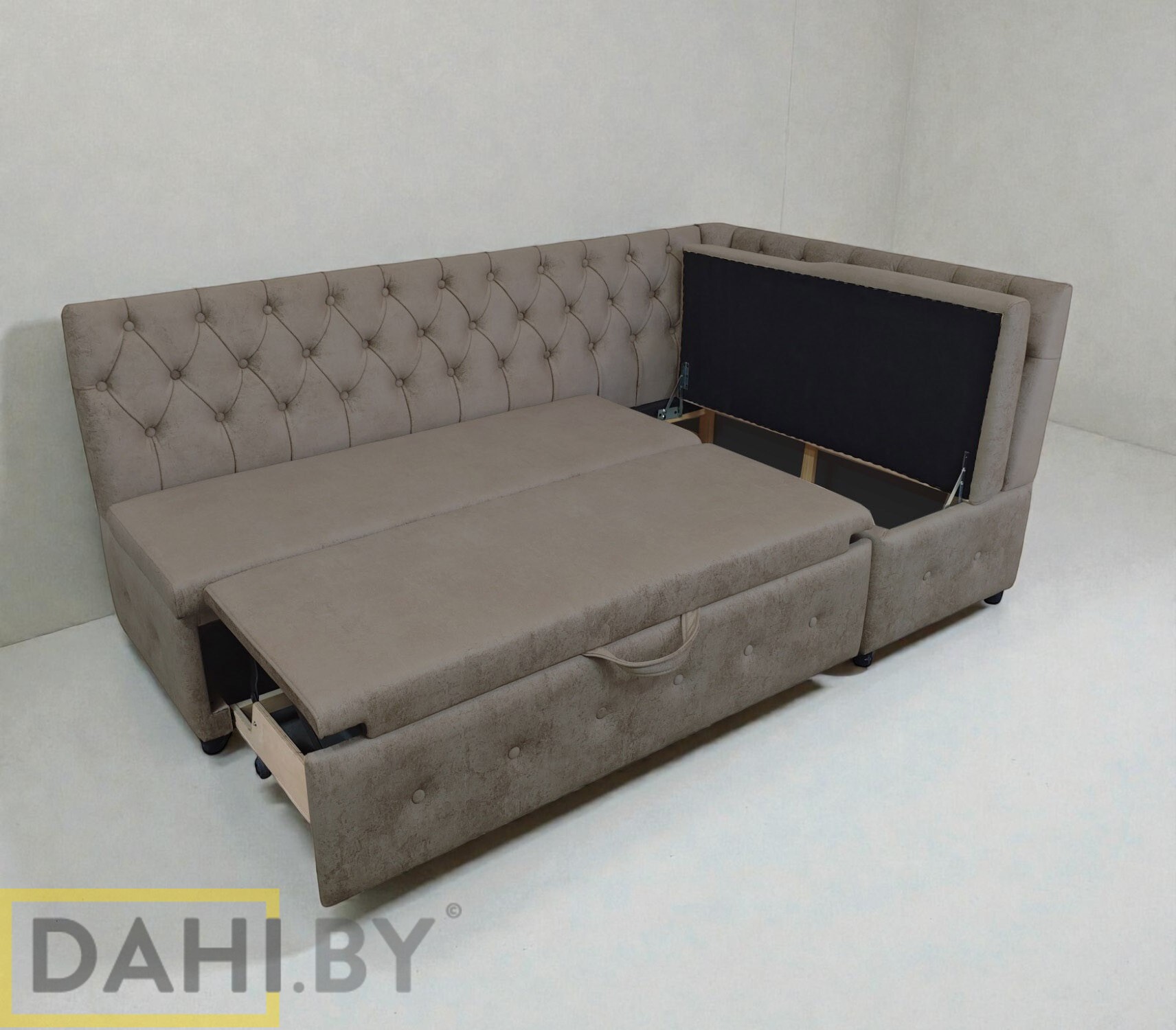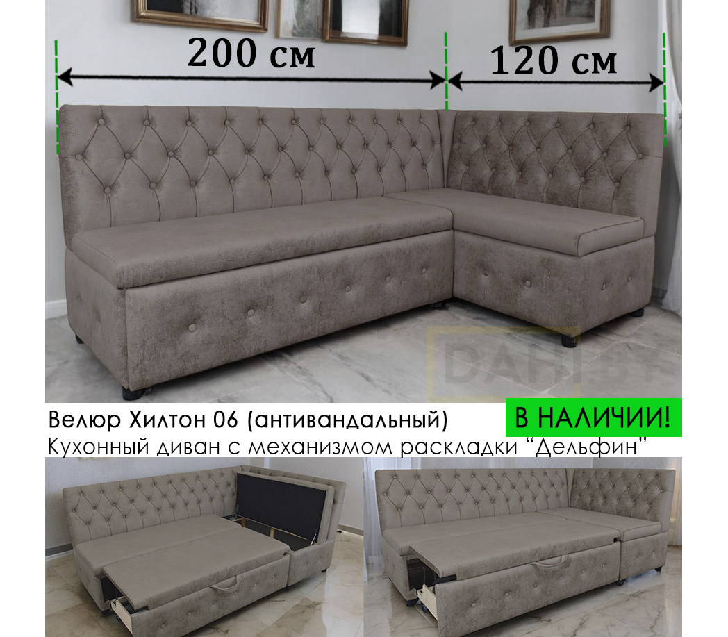 Конструкция модели раскладная благодаря механизму трансформации дельфин, превращающему кухонный уголок в удобное спальное место.
