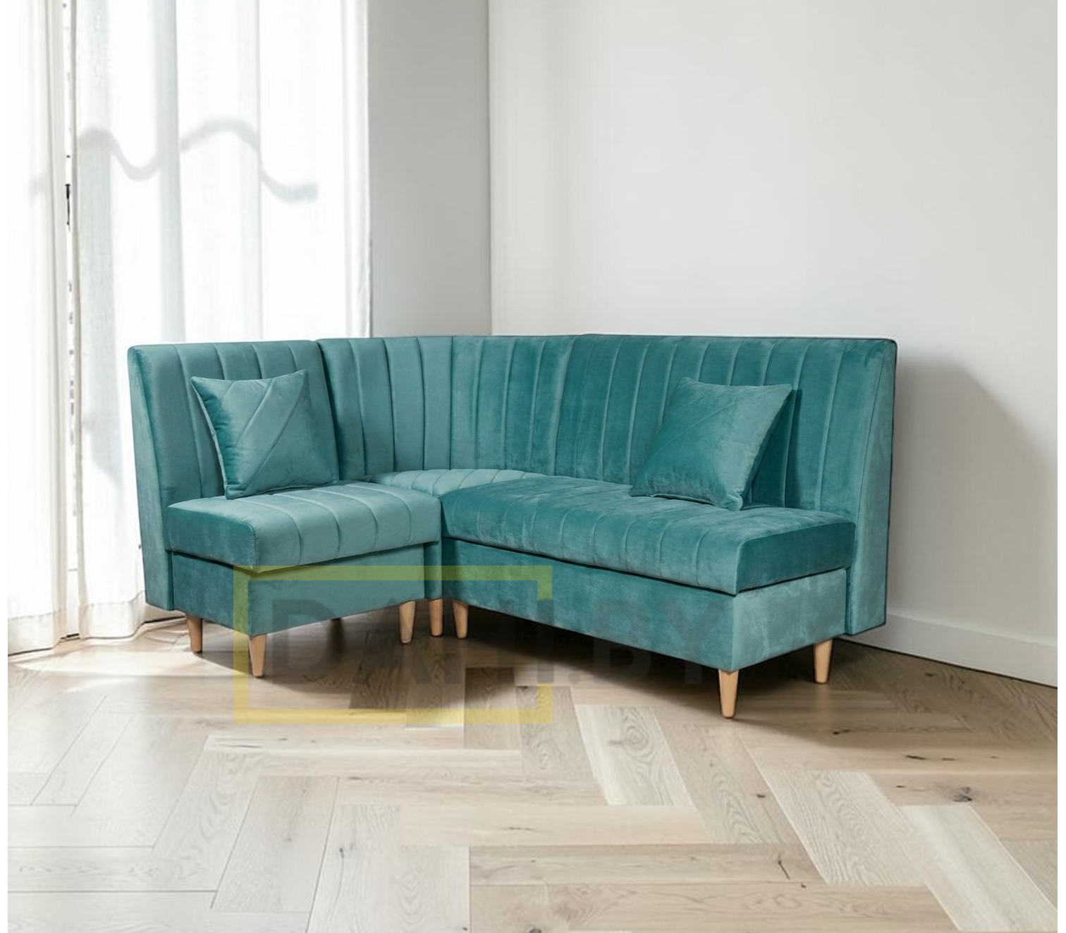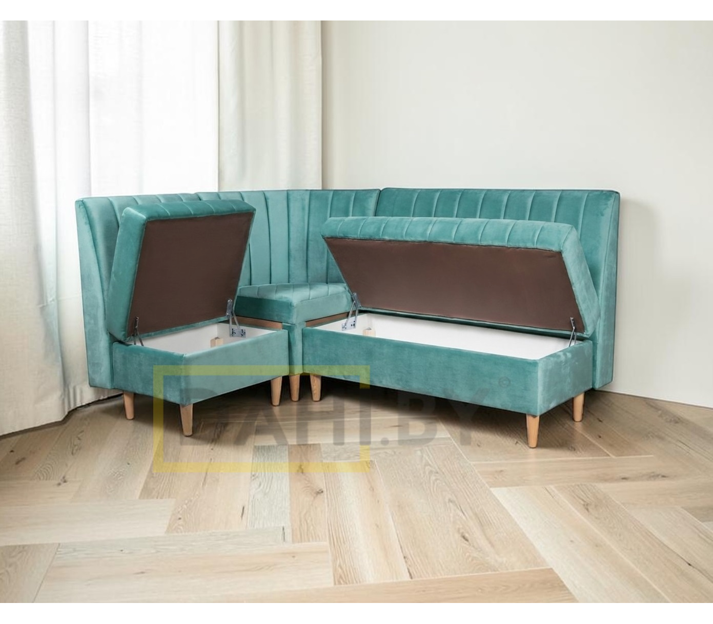 Длина меняется по левой и по правой стороне, размеры угловой секции, глубина и высота скамьи остаются неизменны. Под сиденьями предусмотрены зоны для хранения.